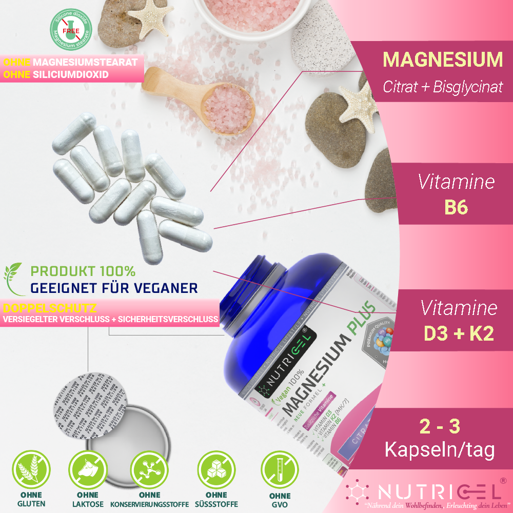 Unsere Kapseln enthalten Magnesiumcitrat und -bisglycinat in Kombination mit essenziellen Vitaminen und garantieren eine hohe Bioverfügbarkeit und maximale Wirksamkeit. Sie werden aus hochwertigen Inhaltsstoffen hergestellt und unter strengen Qualitätskontrollen in akkreditierten Laboren auf Reinheit und Sicherheit geprüft. Frei von Gluten, Laktose und Gentechnik.