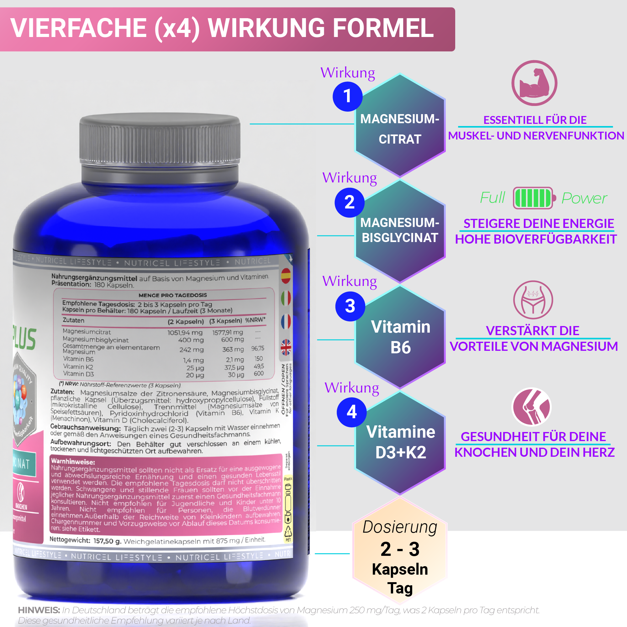 Täglich 2 bis 3 Kapseln mit einem Glas Wasser einnehmen, gemäß den Empfehlungen eines Gesundheitsfachmanns. Die Tagesdosis liefert bis zu 362 mg Magnesium aus Magnesiumcitrat und -bisglycinat und sorgt für eine optimale Aufnahme ohne abführende Wirkung. Zusätzlich enthält sie Vitamin B6, K2 und D3 zur Verstärkung der gesundheitlichen Vorteile. Mit 180 Kapseln reicht die Packung für bis zu 3 Monate Muskel-, Nerven- und Energiesupport.